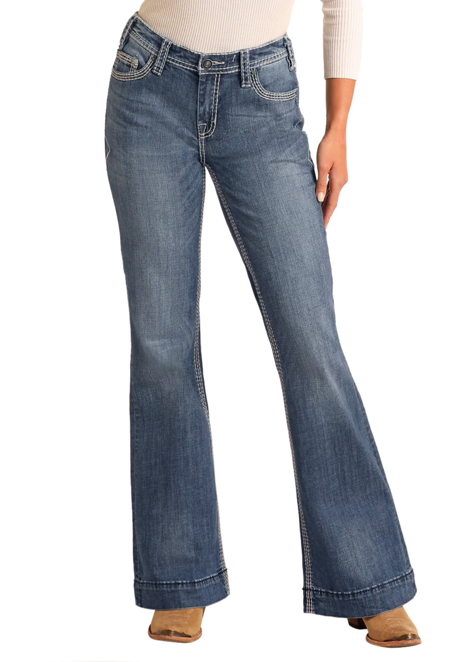 The Mid Rise Petal Stitch Trousers feature a flattering mid-rise fit with eye-catching petal stitch embroidery for a standout look. Crafted from a comfortable stretch denim blend of 98% cotton and 2% spandex, finished in a versatile dark wash.