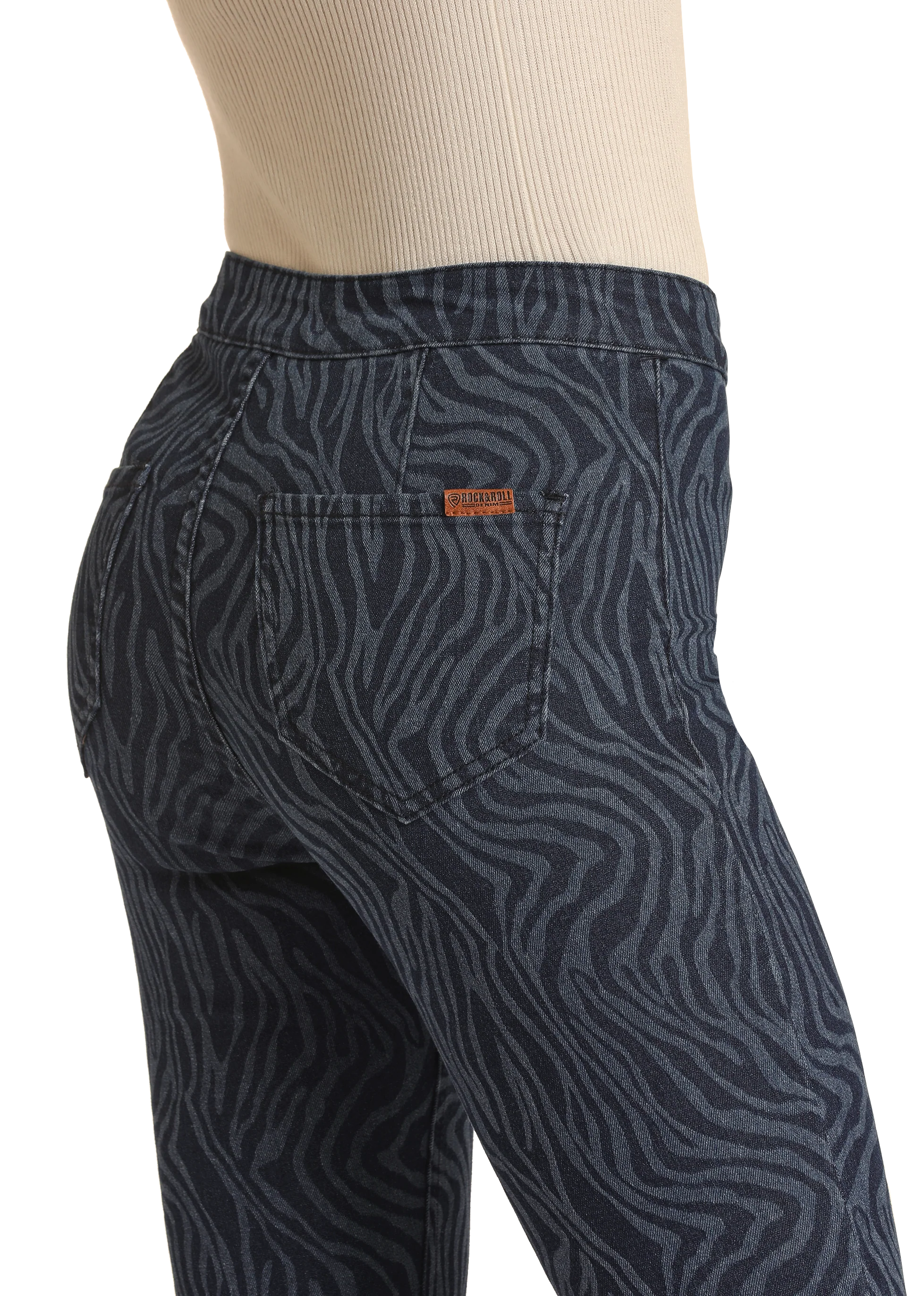 Add a touch of western allure with these zebra print high rise bell bottom jeans crafted from cotton-spandex with a zip fly closure.
